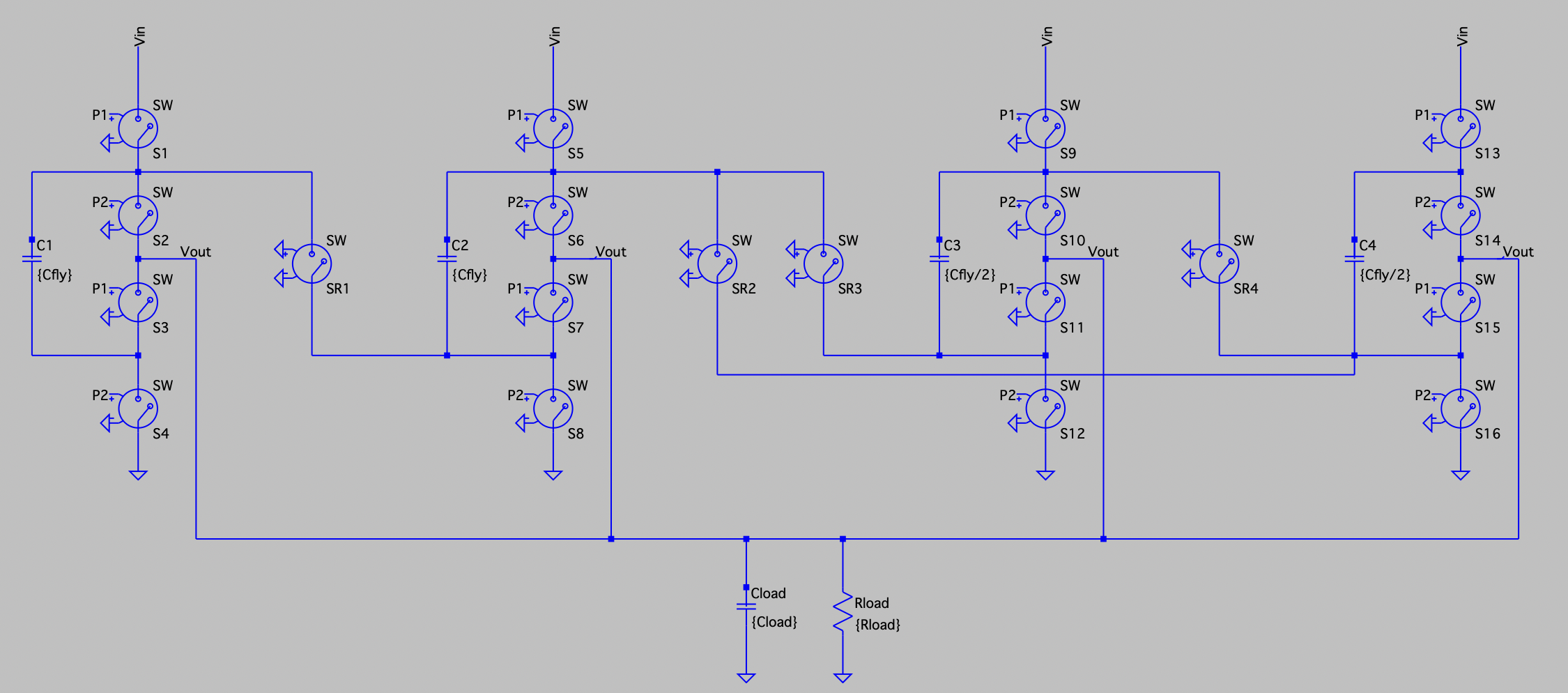 Designed PCB and tested a series-parallel switched-capacitor DC-DC converter with multiple voltage conversion ratios (1:2, 1:3, 2:3, 3:5, 4:5) at 10 kHz–1 MHz. Optimized topology and switching in MATLAB, achieving 92% peak efficiency.